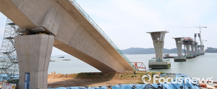 (영광=포커스뉴스) 8일 오전 전남 영광군 염산면과 무안군 해제면을 잇는 칠산대교 건설현장에서 상판 구조물이 무너져 노동자 6명이 부상을 입는 사고가 발생, 칠산대교는 가운데 교각을 중심으로 상판이 한쪽으로 기울듯 무너져 내려 있다.