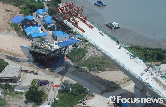 (영광=포커스뉴스) 8일 오전 전남 영광군 염산면과 무안군 해제면을 잇는 칠산대교 건설현장에서 상판 구조물이 무너져 노동자 6명이 부상을 입는 사고가 발생, 칠산대교는 가운데 교각을 중심으로 상판이 한쪽으로 기울듯 무너져 내려 있다.