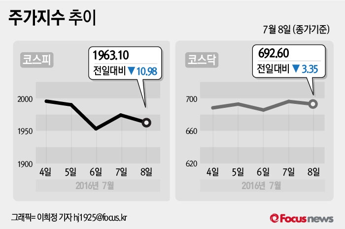 (서울=포커스뉴스) 8일 코스피지수는 전날보다 0.56%(10.98포인트) 내린 1963.10에 장을 마쳤다. 코스닥지수는 전일 대비 0.48%(3.35포인트) 내린 692.60에 마감했다.