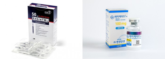 그는 “환자는 보험약가에서 본인부담금 10%만 부담하기 때문에 4주 기준으로 몇천원 정도 오르게 될 것”이라며 “몇천원은 금액이 크지 않아 보일 수도 있지만 평생을 치료받아야 한다고 하면 이 역시도 적지 않은 부담이 된다”고 설명했다.국내에 출시된 바이오의약품 엔브렐(왼쪽), 레미케이드 제품. <사진출처=한국화이자제약, 한국얀센>