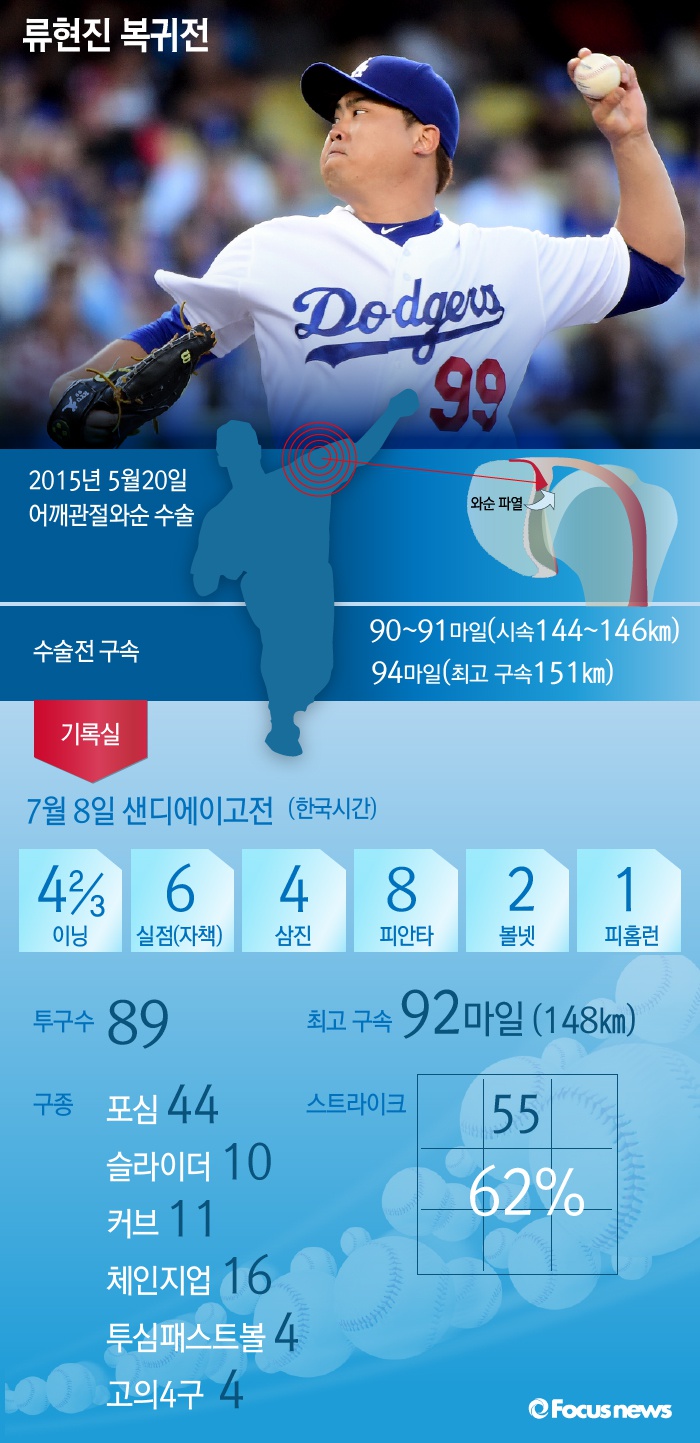 류현진은 8일 샌디에이고전에서 선발등판해 공 89개를 던졌다. 포심패스트볼 최고구속은 92마일(약 148㎞)을 기록했다. 4회초까지 포심패스트볼 평균구속도 90마일(약 145㎞)로 나쁘지 않았다.