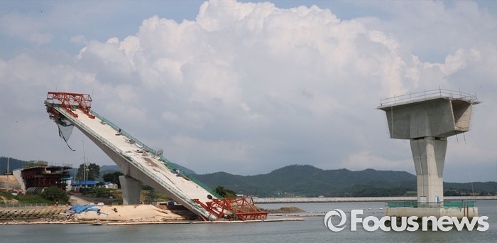 (영광=포커스뉴스) 8일 오전 전남 영광군 염산면과 무안군 해제면을 잇는 칠산대교 건설현장에서 상판 구조물이 무너져 노동자 6명이 부상을 입는 사고가 발생, 칠산대교는 가운데 교각을 중심으로 상판이 한쪽으로 기울듯 무너져 내려 있다.