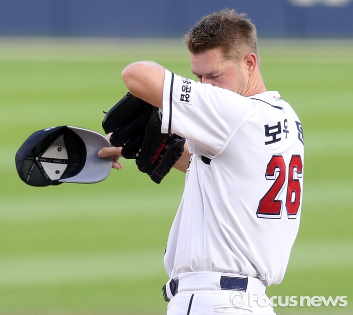 (서울=포커스뉴스) 8일 서울 잠실구장에서 열린 2016 프로야구 KIA-두산 경기 3회초 두산 투수 보우덴이 얼굴의 땀을 닦고 있다.