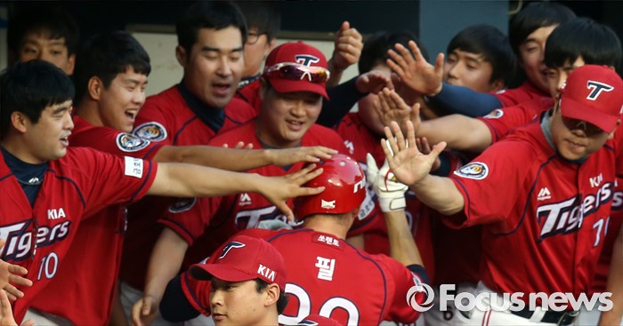 (서울=포커스뉴스) 8일 서울 잠실구장에서 열린 2016 프로야구 KIA-두산 경기 3회초 2사 1,3루에서 KIA 필이 좌월 3점 홈런을 치고 덕아웃에서 동료들의 열렬한 환영을 받고 있다.