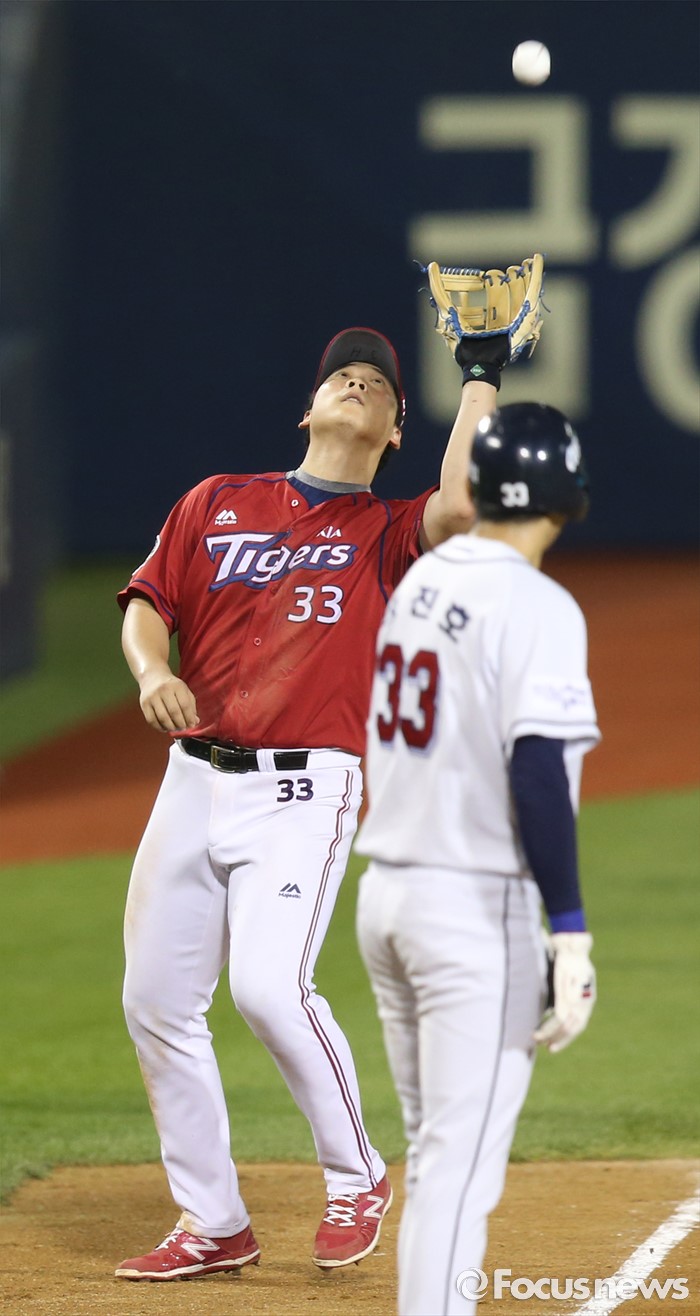 (서울=포커스뉴스) 8일 서울 잠실구장에서 열린 2016 프로야구 KIA-두산 경기 9회말 1사 3루에서 KIA 3루수 김주형이 두산 류지혁의 3루쪽 파울플라이를 잡고 있다.