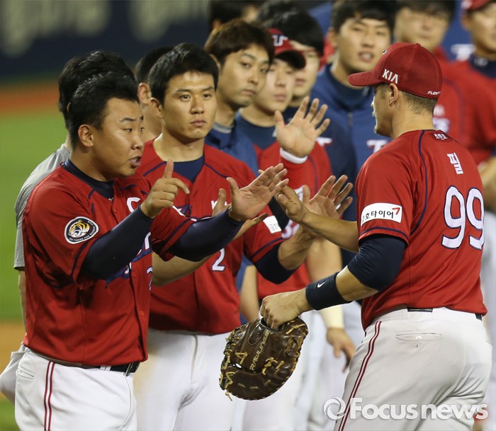 (서울=포커스뉴스) 8일 서울 잠실구장에서 열린 2016 프로야구 KIA-두산 경기에서 두산을 물리친 KIA 주장 이범호가 필과 하이파이브하고 있다.
