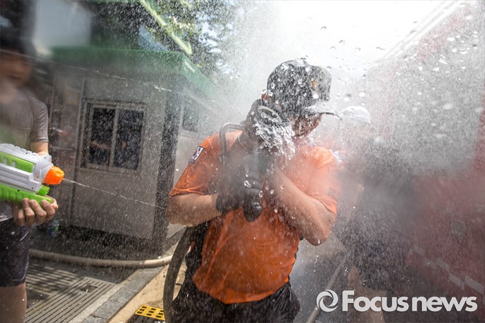 | △ 시민들에게 물총 공격 당하는 소방대원 |