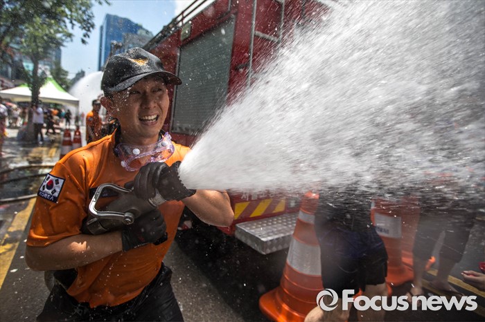 (서울=포커스뉴스) 9일 오후 서울 서대문구 신촌 연세로에서 열린 '2016 물총축제' 에서 한 소방대원이 시민들을 향해 물을 뿌리고 있다.