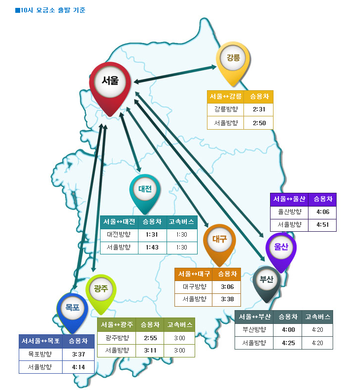주요 도시에서 서울까지 소요되는 시간은 오전 10시 기준 강릉 2시간50분, 대구 3시간38분, 울산 4시간51분, 부산 4시간25분, 광주 3시간11분, 목포 4시간14분, 대전 1시간43분 등이다.