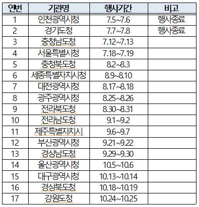 각 지자체별 개최일정으로, 인천, 경기, 충남, 서울은 7월, 충북, 세종, 대전, 광주, 전북은 8월, 전남, 제주, 부산, 경남은 9월, 울산, 대구, 경북, 강원은 10월에 개최한다.