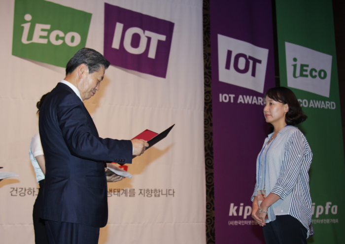 한편 7회째를 맞이한 '인터넷 에코어워드'는 혁신적인 인터넷 비즈니스 및 서비스 모델, 인터넷 기술개발 등 인터넷생태계 발전에 기여한 단체 및 개인을 시상하는 행사로, 아이어워드위원회가 주최하고 한국인터넷전문가협회가 주관한다. 올해는 총 7개 부문 36개 분야에 걸쳐 123개 업체의 150여개 인터넷서비스가 후보로 등록돼 열띤 경쟁을 펼쳤다.이지해(오른쪽) 인터파크투어 PM(온라인 여행박람회)팀 팀장이 지난 8일 열린 인터넷에코어워드 2016 고객서비스 분야 대상을 수상하고 있다.<사진제공=인터파크투어>