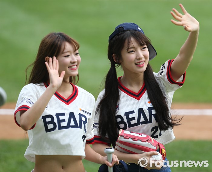 (서울=포커스뉴스) 10일 서울 잠실구장에서 열린 2016 프로야구 넥센-두산 경기에 앞서 걸그룹 '오마이걸'의 아린(왼쪽)괴 유아가 시구, 시타후 관중에게 손을 흔들며 인사하고 있다.