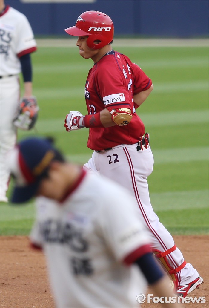 (서울=포커스뉴스) 10일 서울 잠실구장에서 열린 2016 프로야구 KIA-두산 경기 3회초 1사후 KIA 백용환이 좌월 솔로 홈런을 치고 그라운드를 돌고 있다.