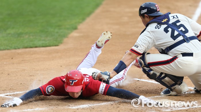 (서울=포커스뉴스) 10일 서울 잠실구장에서 열린 2016 프로야구 KIA-두산 경기 3회초 1사 만루에서 KIA 김주찬의 2루 땅볼떄 2루주자 김호령이 홈으로 뛰어들다 두산 포수 양의지에게 태그아웃되고 있다.