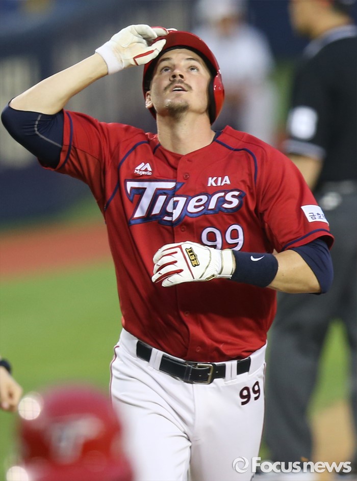 (서울=포커스뉴스) 10일 서울 잠실구장에서 열린 2016 프로야구 KIA-두산 경기 5회초 2사 1루에서 KIA 브렛 필이 좌월 2점 홈런을 치고 세리머니를 하며 홈인하고 있다.