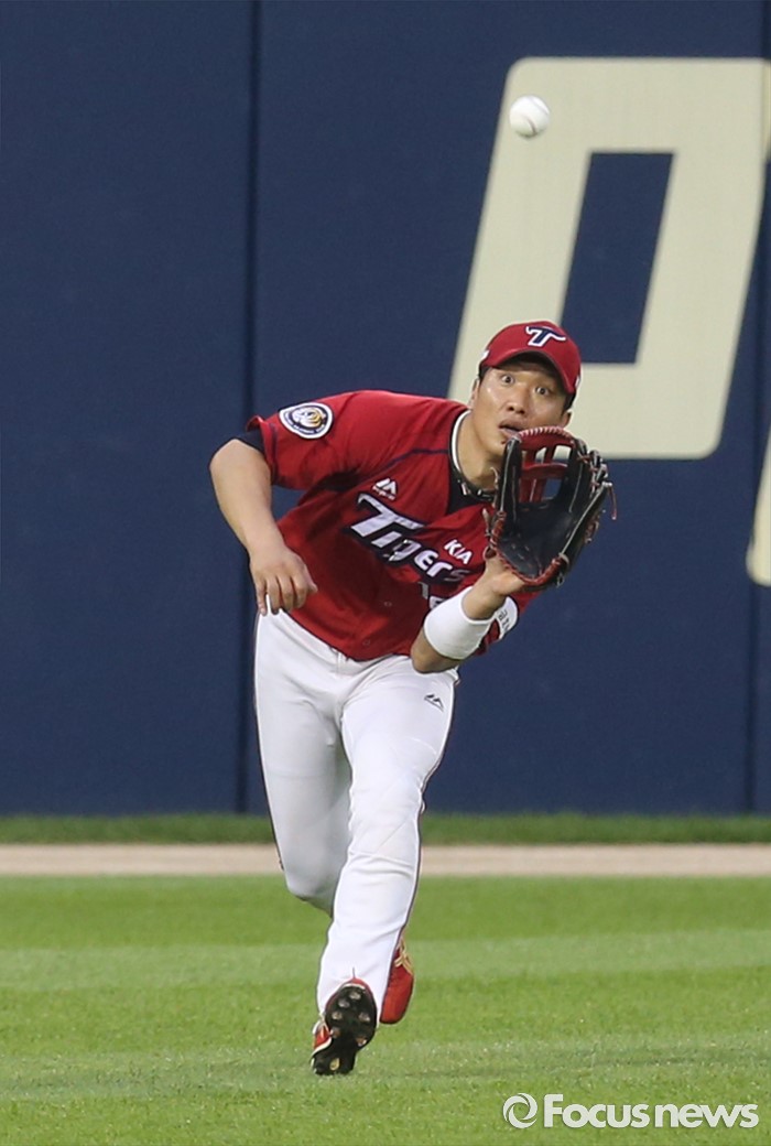 (서울=포커스뉴스) 10일 서울 잠실구장에서 열린 2016 프로야구 KIA-두산 경기 4회말 2사 1,2루에서 KIA 좌익수 김주찬이 두산 에반스의 외야플라이 타구를 달려오며 잡고 있다.