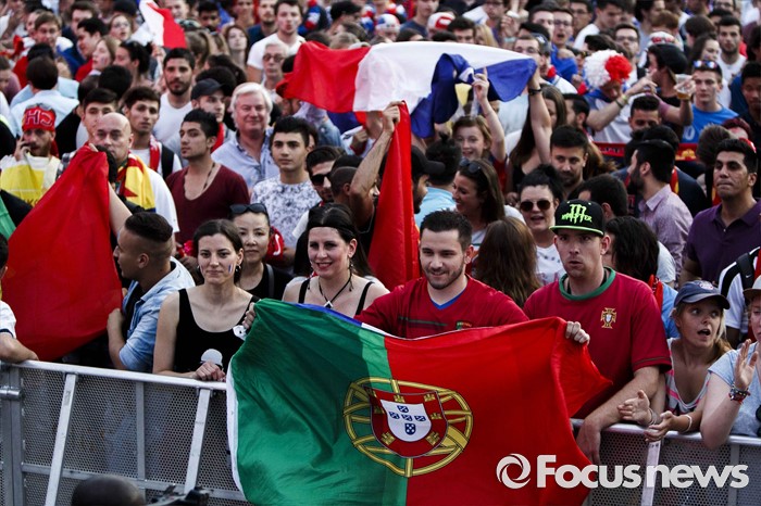 BERLIN, GERMANY - JULY 10: Football fans watch the 2016 UEFA European Championship final match between France and Portugal at a public viewing area on a large outdoor screen at Brandenburg Gate on July 10, 2016 in Berlin, Germany. (Photo by Carsten Koall/Bongarts/Getty Images)