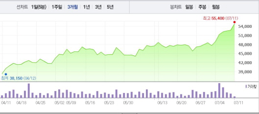 한화테크윈은 11일 오전 9시22분 현재 전일 대비 4.17%(2200원) 상승한 5만4900원에 거래되고 있다. 한화테크윈은 4일부터 이날까지 1~4%의 상승폭을 기록하며 6거래일 연속 상승세다.