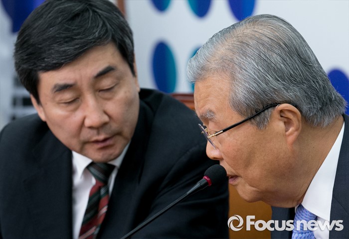 (서울=포커스뉴스) 11일 오전 서울 여의도 국회에서 열린 더불어민주당 비상대책위원회의에 참석한 김종인(오른쪽) 비대위 대표와 우상호 원내대표가 대화하고 있다.