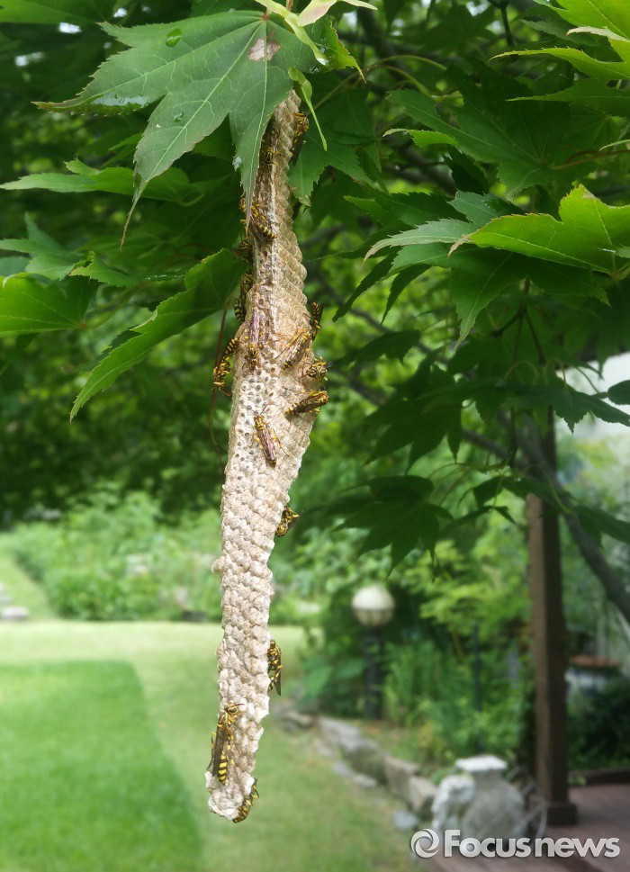 (남양주=포커스뉴스) 11일 오전 경기 남양주시 능내면 주택가 정원에서 뱀허물쌍살벌과 벌집이 발견됐다. 벌집 모양이 허물을 벗은 뱀 같아서 이름이 붙여진 뱀허물쌍살벌은 한국, 중국, 일본, 동남아에 분포하며, 크기는 10~ 22mm 정도로 암컷이 크다. <사진제공=조승호 사진가>