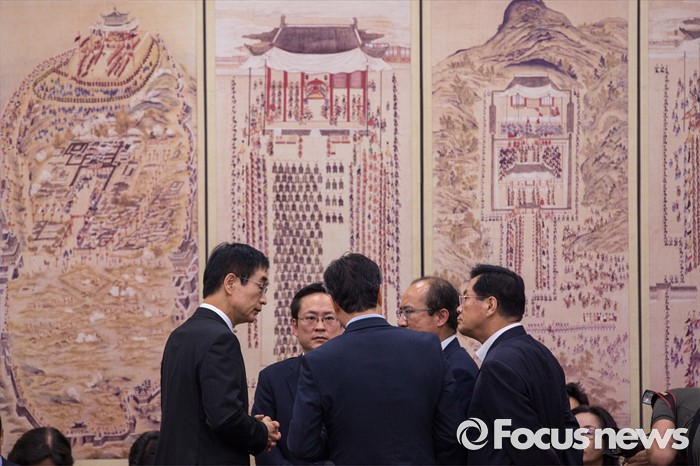 (서울=포커스뉴스) 이준식(왼쪽) 교육부 장관이 11일 오전 서울 여의도 국회에서 열린 교육문화체육관광위원회 전체회의에 참석해 '개돼지 발언 논란'을 일으킨 나향욱 교육부 정책기획관 출석 요구 공방으로 회의가 정회되자 교육부 관계자들과 의견을 교환 하고 있다.