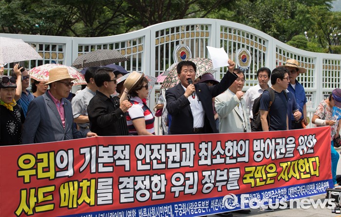 (서울=포커스뉴스) 11일 오전 서울 종로구 정부서울청사 정문 앞에서 열린 사드 배치 환영 기자회견에 참석한 보수단체 회원들이 사드 반대 세력을 규탄하는 구호를 외치고 있다.