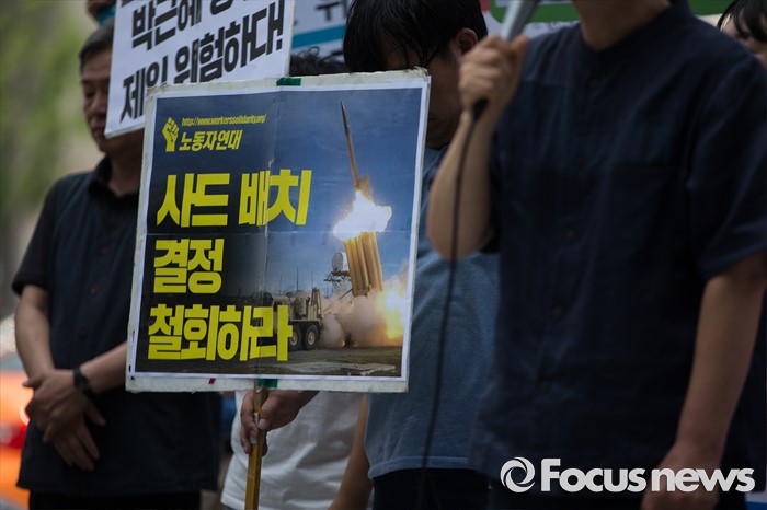 (서울=포커스뉴스) '평화와 통일을 여는 사람들' 관계자 및 사드 한국 배치를 반대하는 시민들이 11일 오전 서울 종로구 창조경제 혁신센터 앞에서 사드 한국 배치 결정 철회 촉구 기자회견을 하고 있다.