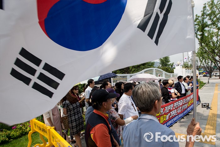 (서울=포커스뉴스) 11일 오전 서울 종로구 정부서울청사 정문 앞에서 열린 사드 배치 환영 기자회견에 참석한 보수단체 회원들이 기자회견문을 읽고 있다.