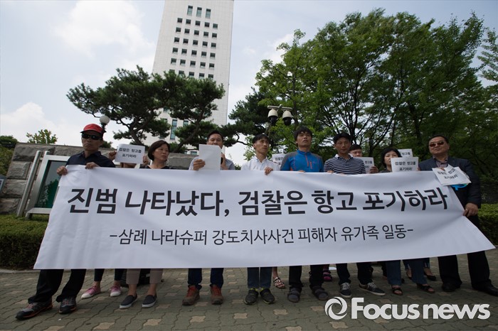 (서울=포커스뉴스) 11일 오전 서울 서초구 대검찰청 앞에서 사건의 피해자와 유가족들이 '삼례 나라슈퍼 3인조 강도치사 사건' 진정서 제출 기자회견을 하고 있다.
