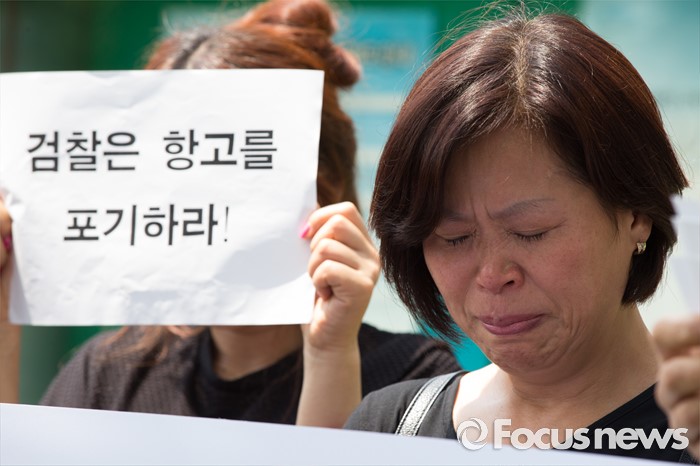 (서울=포커스뉴스) 11일 오전 서울 서초구 대검찰청 앞에서 열린 '삼례 나라슈퍼 3인조 강도치사 사건' 진정서 제출 기자회견에서 사건의 피해자가 눈물을 흘리고 있다.