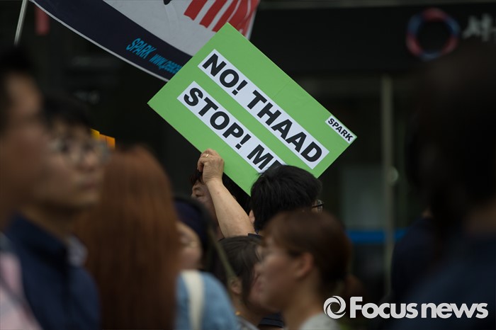 (서울=포커스뉴스) '평화와 통일을 여는 사람들' 관계자 및 사드 한국 배치를 반대하는 시민들이 11일 오전 서울 종로구 창조경제 혁신센터 앞에서 사드 한국 배치 결정 철회 촉구 기자회견을 하고 있다.