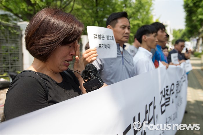 (서울=포커스뉴스) 11일 오전 서울 서초구 대검찰청 앞에서 열린 '삼례 나라슈퍼 3인조 강도치사 사건' 진정서 제출 기자회견에서 사건의 피해자가 눈물을 흘리고 있다.