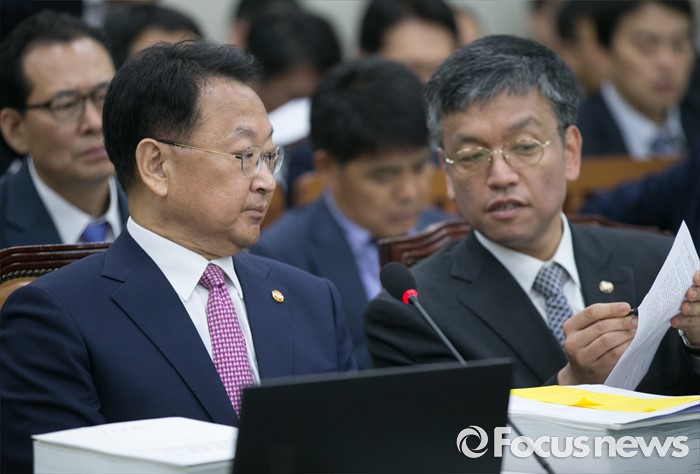 (서울=포커스뉴스) 11일 오전 서울 여의도 국회에서 열린 기획재정위원회 전체회의에 참석한 유일호(왼쪽) 경제부총리 겸 기획재정부 장관이 최상목 1차관과 대화하고 있다.