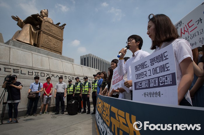 (서울=포커스뉴스) 11일 오전 서울 종로구 미 대사관 앞에서 한반도 사드 배치에 반대하는 대학생들이 기자회견을 하고 있다.