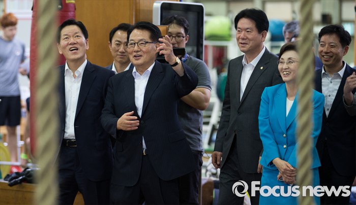 (서울=포커스뉴스) 박지원 국민의당 비상대책위원장을 비롯한 주요 당직자들이 11일 오후 서울 노원구 태릉선수촌에 방문해 국가대표 선수 훈련장을 둘러보고 있다.