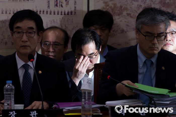 나 기획관은 '본인의 직을 사퇴하겠다는 생각을 안해봤느냐'는 한선교 새누리당 의원의 질문에는 "사퇴를 하고 싶다는 생각을 했었다"며 "운영지원과에 알아봤는데 지금은 사표를 내도 수리가 안 된다고 해서 (못했다)"고 강조했다.민중을 개, 돼지로 표현한 발언으로 비판을 받고 있는 나향욱(가운데) 교육부 정책기획관이 11일 오후 서울 여의도 국회에서 열린 교육문화체육관광위원회 전체회의에 참석해 얼굴을 만지고 있다. 2016.07.11 강진형 기자