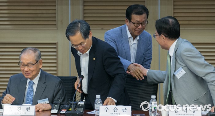 (서울=포커스뉴스) 12일 오전 서울 여의도 국회 의원회관에서 국가전략포럼 주최로 열린 국민이 바라는 개헌, 어떻게 할 것인가? 세미나에 참석한 원혜영 더불어민주당 의원과 김덕룡 민주화추진협의회 이사장이 인사하고 있다. 왼쪽부터 김진현 세계평화포럼 이사장, 우윤근 국회 사무총장, 원 의원, 김 이사장.
