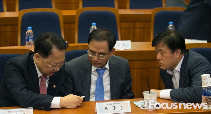 (서울=포커스뉴스) 12일 오전 서울 여의도 국회 헌정기념관에서 열린 글로벌금융학회 정책심포지엄에 유일호(왼쪽부터) 경제부총리 겸 기획재정부 장관, 오갑수 글로벌금융학회장, 이진복 국회 정무위원장이 대화하고 있다.