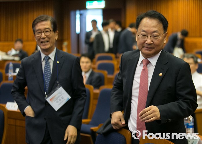 (서울=포커스뉴스) 12일 오전 서울 여의도 국회 헌정기념관에서 열린 글로벌금융학회 정책심포지엄에 유일호(오른쪽) 경제부총리 겸 기획재정부 장관과 이동걸 KDB산업은행 회장이 참석하고 있다.