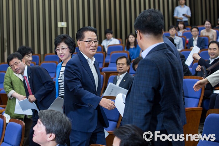 (서울=포커스뉴스) 박지원 국민의당 비상대책위원장이 12일 오전 서울 여의도 국회에서 열린 의원총회에 참석해 동료의원들과 악수하고 있다.