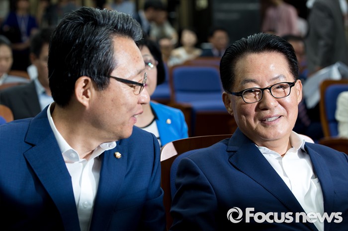 (서울=포커스뉴스) 박지원(오른쪽) 국민의당 비상대책위원장과 김성식 정책위의장이 12일 오전 서울 여의도 국회에서 열린 의원총회에 참석해 대화 하고 있다.