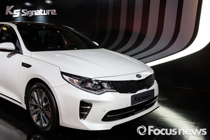 (서울=포커스뉴스) 12일 오전 서울 강남구 인터와이드 스튜디오에서 열린 '2017 K5, K5 PHEV' 출시 사진 및 영상 발표회에 K5 'Signature' 차량이 전시되어 있다.
