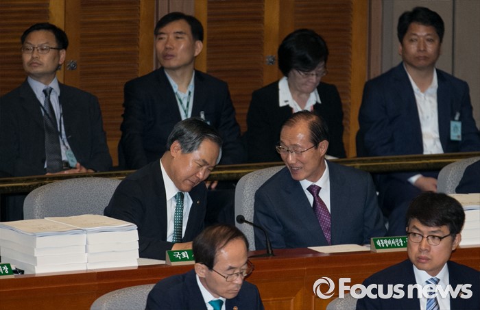 (서울=포커스뉴스) 12일 오전 서울 여의도 국회에서 2015회계연도 결산을 위해 열린 예산결산특별위원회 전체회의에 참석한 이원종(오른쪽) 대통령비서실장과 우윤근 국회 사무총장이 대화하고 있다.