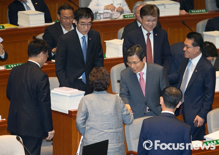 (서울=포커스뉴스) 12일 오전 서울 여의도 국회에서 2015회계연도 결산을 위해 열린 예산결산특별위원회 전체회의에 참석한 황교안 국무총리와 김현미 위원장이 인사하고 있다.