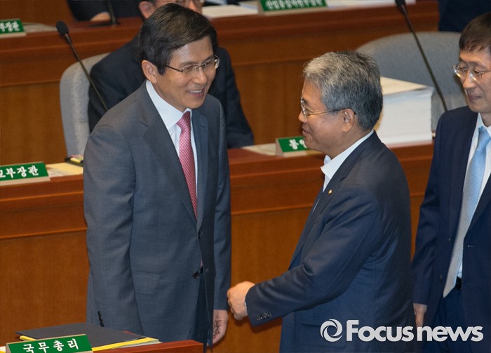 (서울=포커스뉴스) 12일 오전 서울 여의도 국회에서 2015회계연도 결산을 위해 열린 예산결산특별위원회 전체회의에 참석한 황교안(왼쪽) 국무총리와 김동철 국민의당 간사가 대화하고 있다.
