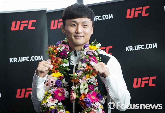 (서울=포커스뉴스) 지난 9일(한국시간) 미국 네바다주 라스베이거스에서 열린 'UFC TUF23' 피날레 페더급 경기에서 티아고 타바레스(브라질)를 1라운드 2분42초 만에 누르고 KO승을 거둔 최두호(25·Team MAD) 선수가 12일 오전 서울 여의도 리복 센티널 IFC에서 기자회견에 앞서 포토타임을 갖고 있다.
