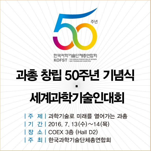 홍남기 차관은 “과총의 50년은 우리나라 과학기술 발전의 역사와 그 맥을 같이해 왔다”며 이번 행사를 통해 “과총이 50년 역사를 회고하고 과학기술 발전을 위한 중심적 역할을 하는 단체로 재도약하여 줄 것”을 당부했다.과총 50주년 기념식 및 세계과학기술인대회 포스터.<사진=과총 홈페이지>
