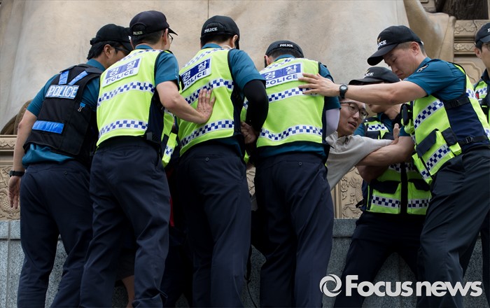 (서울=포커스뉴스) 12일 오전 서울 종로구 광화문광장 세종대왕 동상에서 알바연대알바노조가 최저임금 1만원 인상을 요구하며 기습시위를 벌이고 있다.