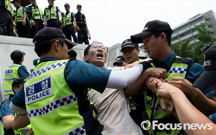 (서울=포커스뉴스) 12일 오전 서울 종로구 광화문광장 세종대왕 동상에서 최저임금 1만원 인상을 요구하며 시위를 하던 알바연대알바노조가경찰에게 연행되고 있다.