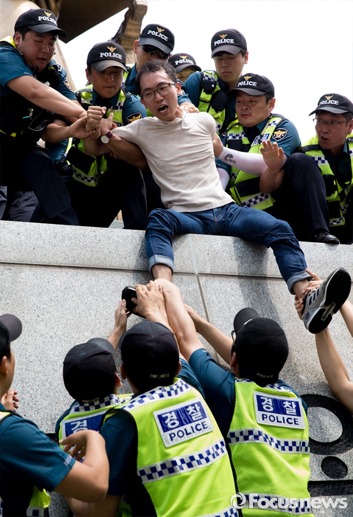(서울=포커스뉴스) 12일 오전 서울 종로구 광화문광장 세종대왕 동상에서 최저임금 1만원 인상을 요구하며 시위를 하던 알바연대알바노조가경찰에게 연행되고 있다.